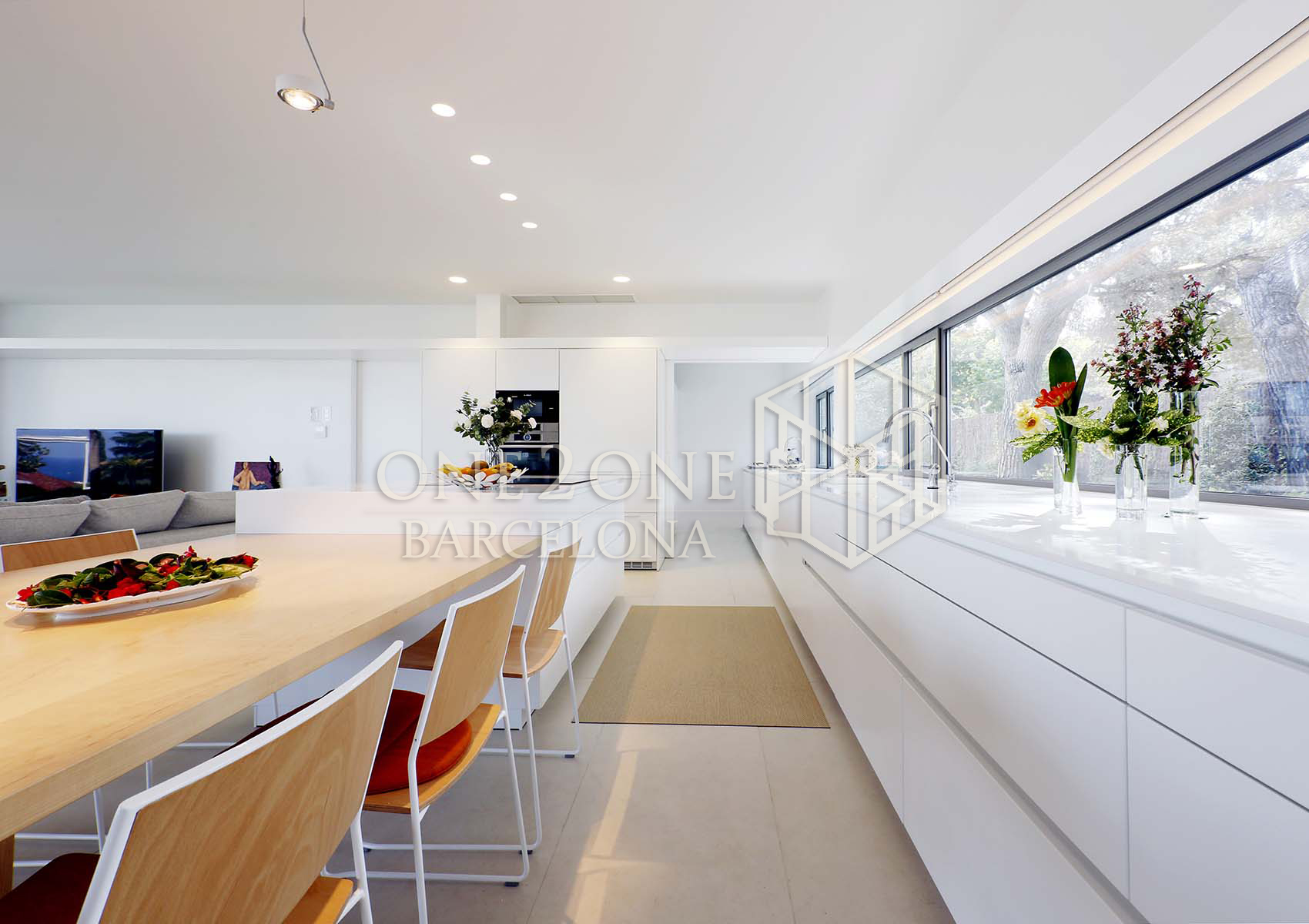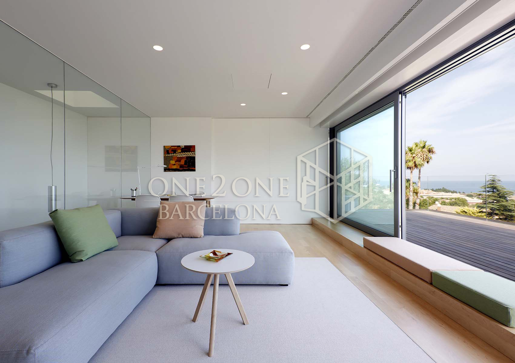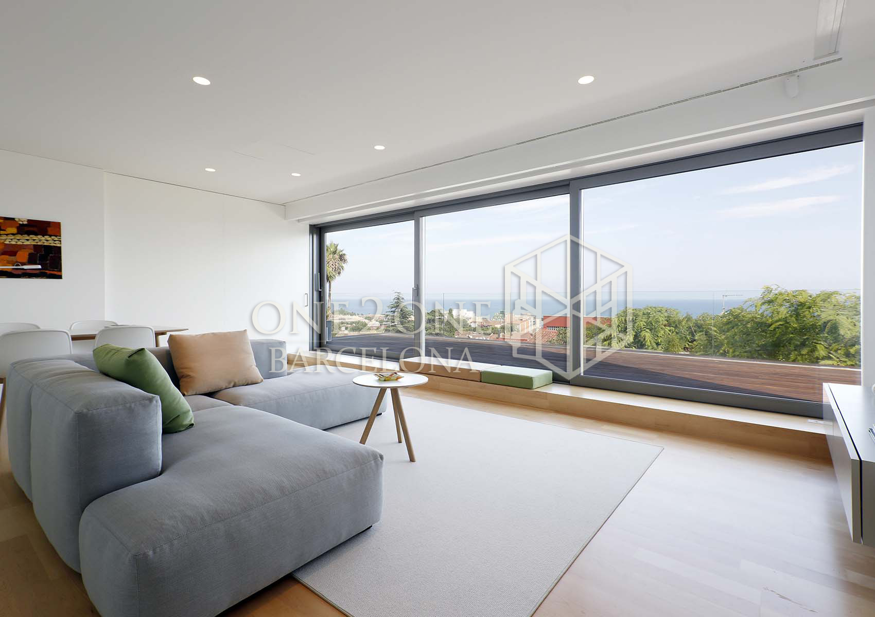 El salón tiene salida directa a la gran terraza de 100m2 con increíbles vistas al mar. Cuando las cristaleras están completamente abiertas, parece que salón y terraza hagan sea un único espacio.