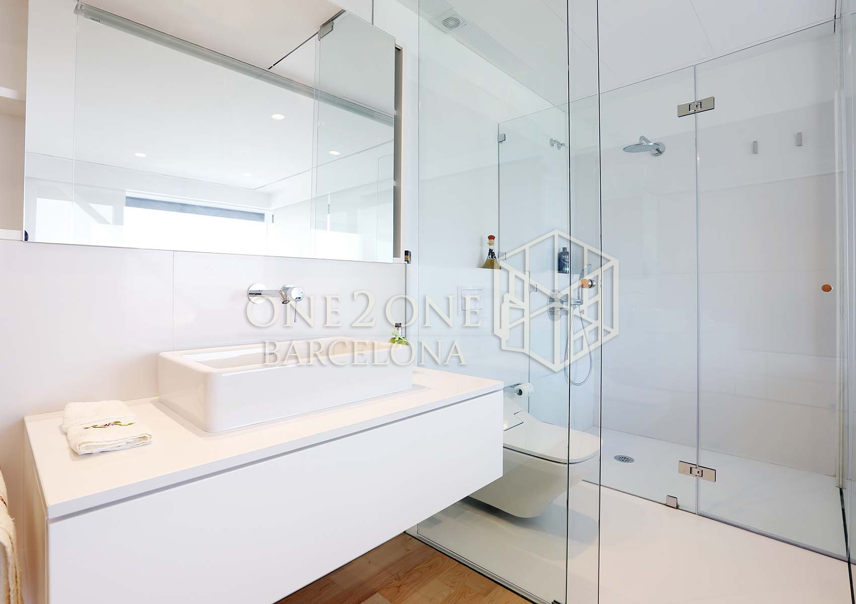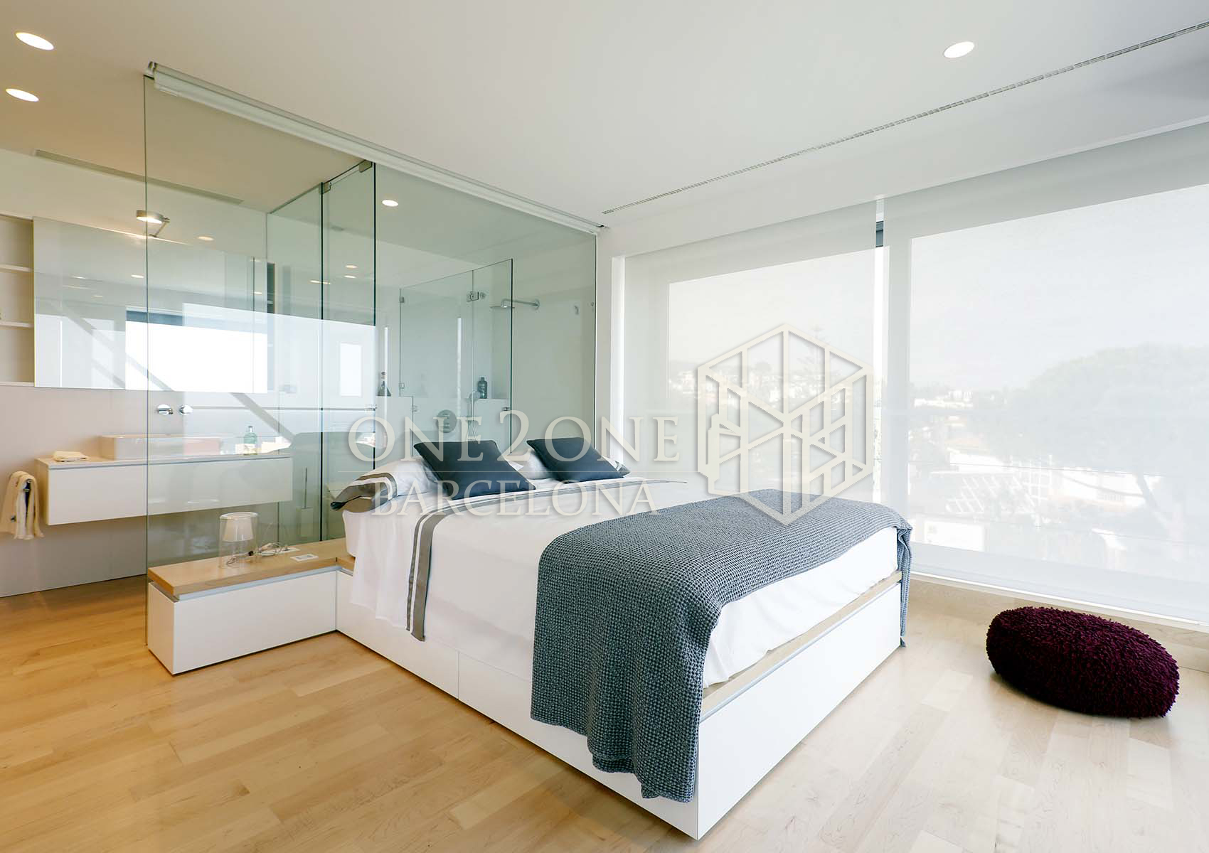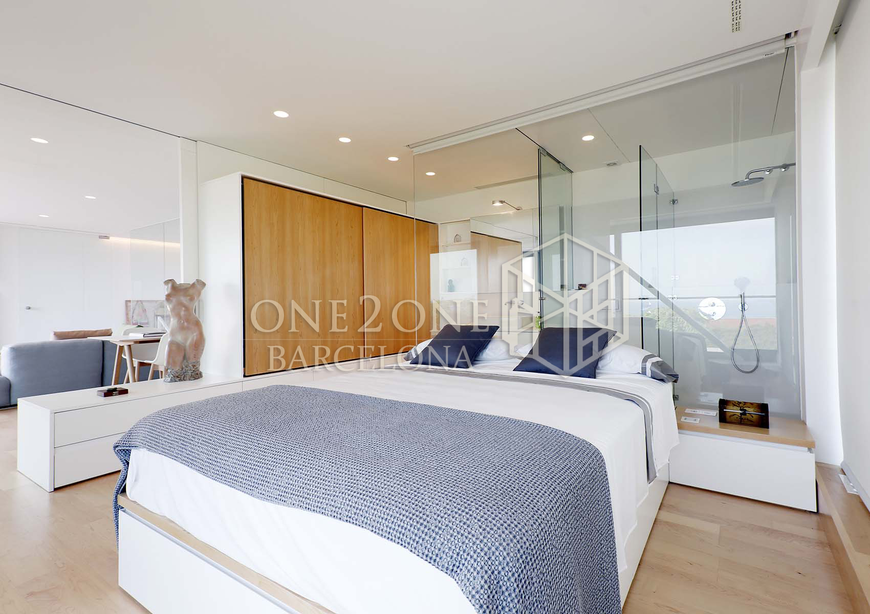 La segunda planta, a la que se accede por unas escaleras flotantes de mamparas acristaladas, nos invitan a un espacio de 70m2 luminoso abierto y muy acogedor. De nuevo los grandes cristales corredizos son protagonistas todo el espacio. Salón privado con bonito sofá, televisión y despacho que colinda con la habitación donde se puede tener intimidad cerrando la puerta corredera que los divide. El dormitorio con la cama rodeada por grandes cristaleras, dejan ver las preciosas vistas hacia el mar y el cielo, dando una sensación de amplitud, paz y bienestar. El cuarto de baño caracterizado también por su estructura de cristal, dejan pasar la luz y vistas al dormitorio.