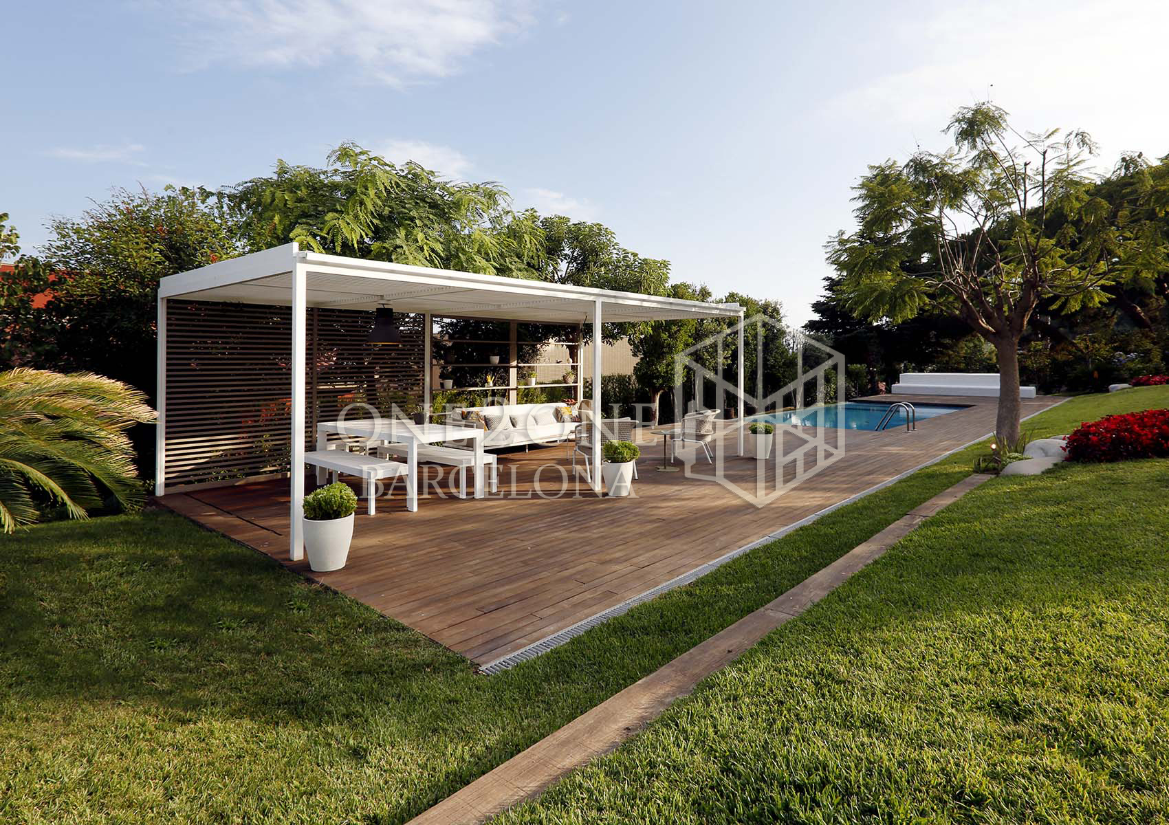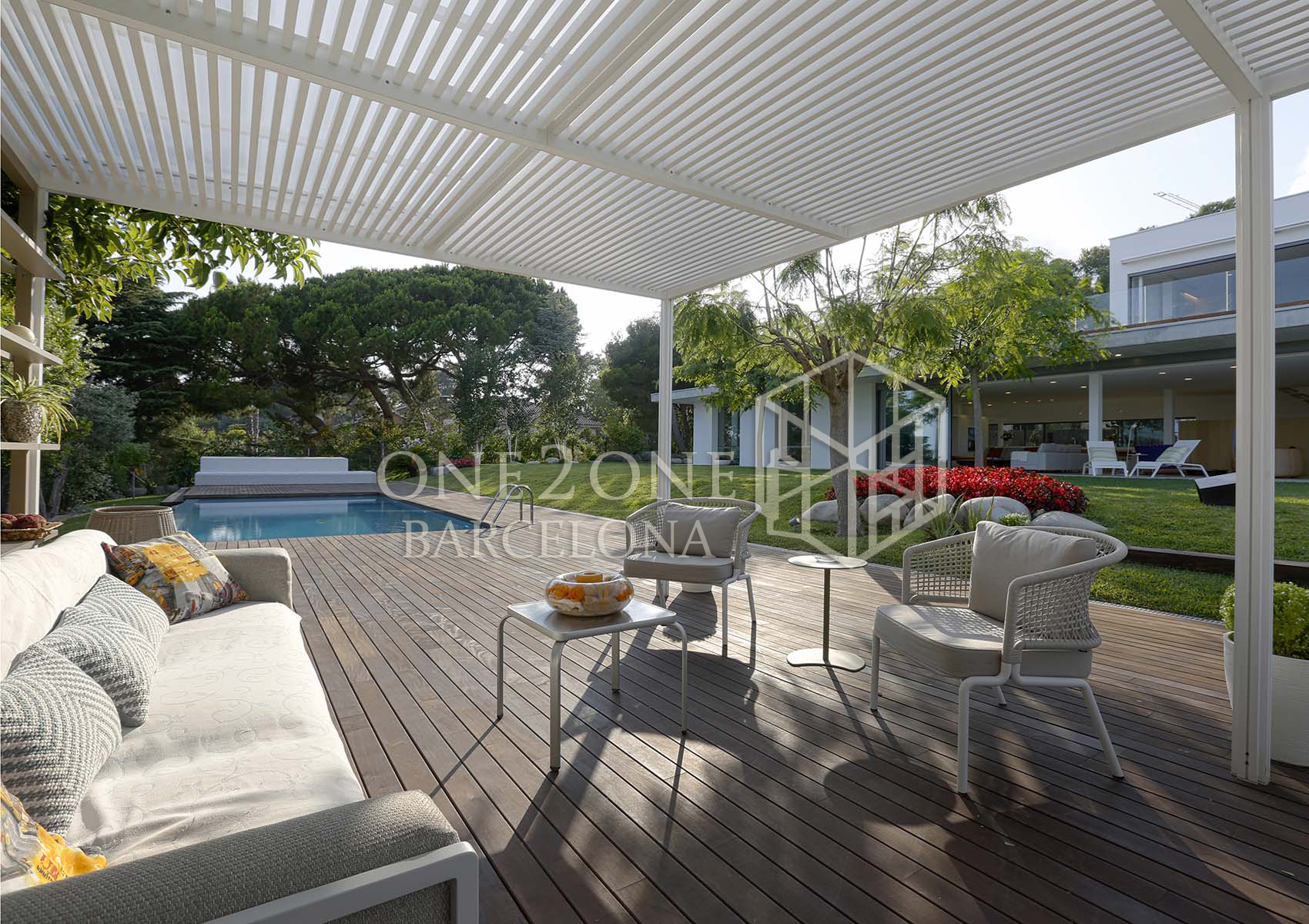 La casa consta de dos plantas: la primera donde se encuentra el gran salón comedor de ventanales corredizos, la cocina abierta-americana, el despacho, un cuarto de baño completo, un cuarto individual, dos en suite y un espectacular jardín con zona chill out, solarium y piscina desbordante.