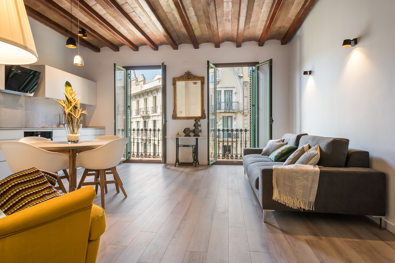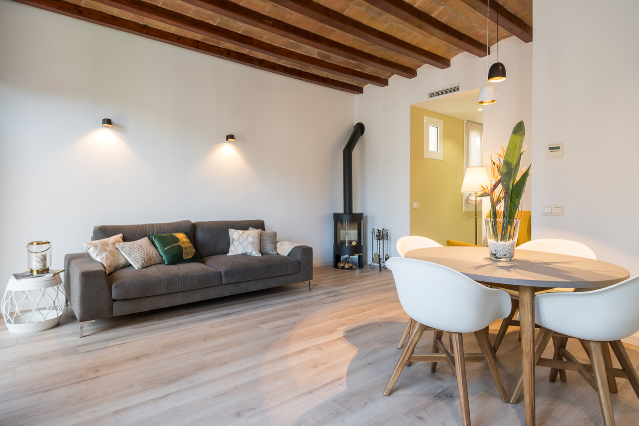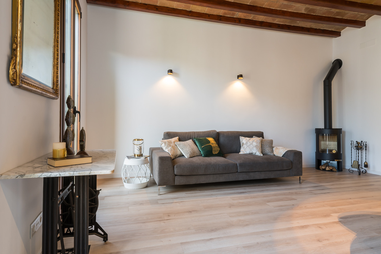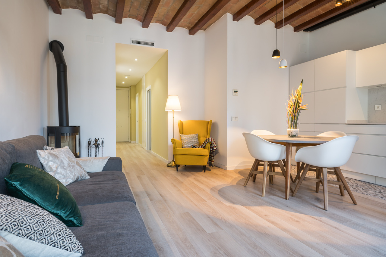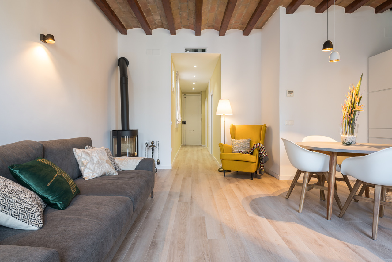 Precioso piso de diseño en la calle Aribau, totalmente amueblado y listo para entrar, que se destaca por maravillosas vistas a la ciudad y a la montaña Tibidabo. Se encuentra en una bonita finca regia en perfecto estado con ascensor moderno, en una quinta planta real. No hay escalones ni escaleras en el portal para acceder al ascensor, es totalmente plano. El piso tiene 70 m2 bien distribuidos entre un dormitorio doble con vestidor, un baño completo con plato de ducha, salón comedor con cocina americana y acceso al balcón. Sol todo el día, cada estancia tiene ventana y goza de luz natural. Se han restaurado las vigas de madera en el techo que están en perfecto estado de conservación, los suelos son de parquet de la marca Porcelanosa, la cocina está equipada, el vestidor hecho a medida, ventanas en el salón son de doble acristalamiento. El piso dispone de aire acondicionado de frío – calor. Para los más románticos la vivienda tiene chimenea de leña, que puede calentar a sus habitantes durante los meses de invierno. El piso se vende semi amueblado con sofá, mesa redonda y sillas en el salón, cama doble con cabezal en el dormitorio, la iluminación está casi toda, faltaría alguna lámpara de pie. Gracias a la altura de la vivienda, las vistas desde el balcón son estupendas y el salón tiene sol prácticamente todo el día. Pieza exclusiva en el corazón de Antigua Eixample Izquierda. Comercios, restaurantes, bares, tiendas, paradas de autobuses – todo a pie. Paseo de Gracia se encuentra a 7 min caminando.