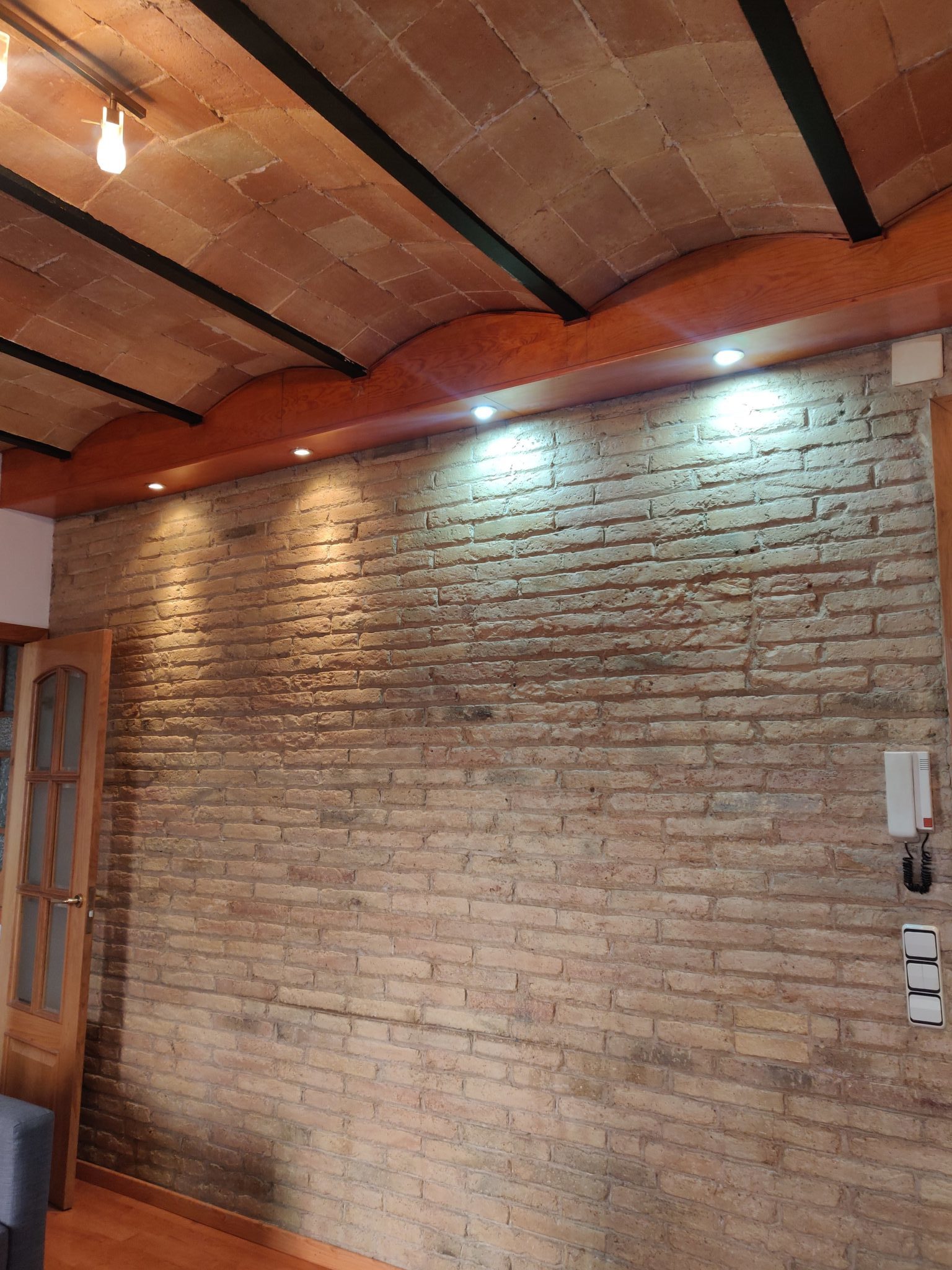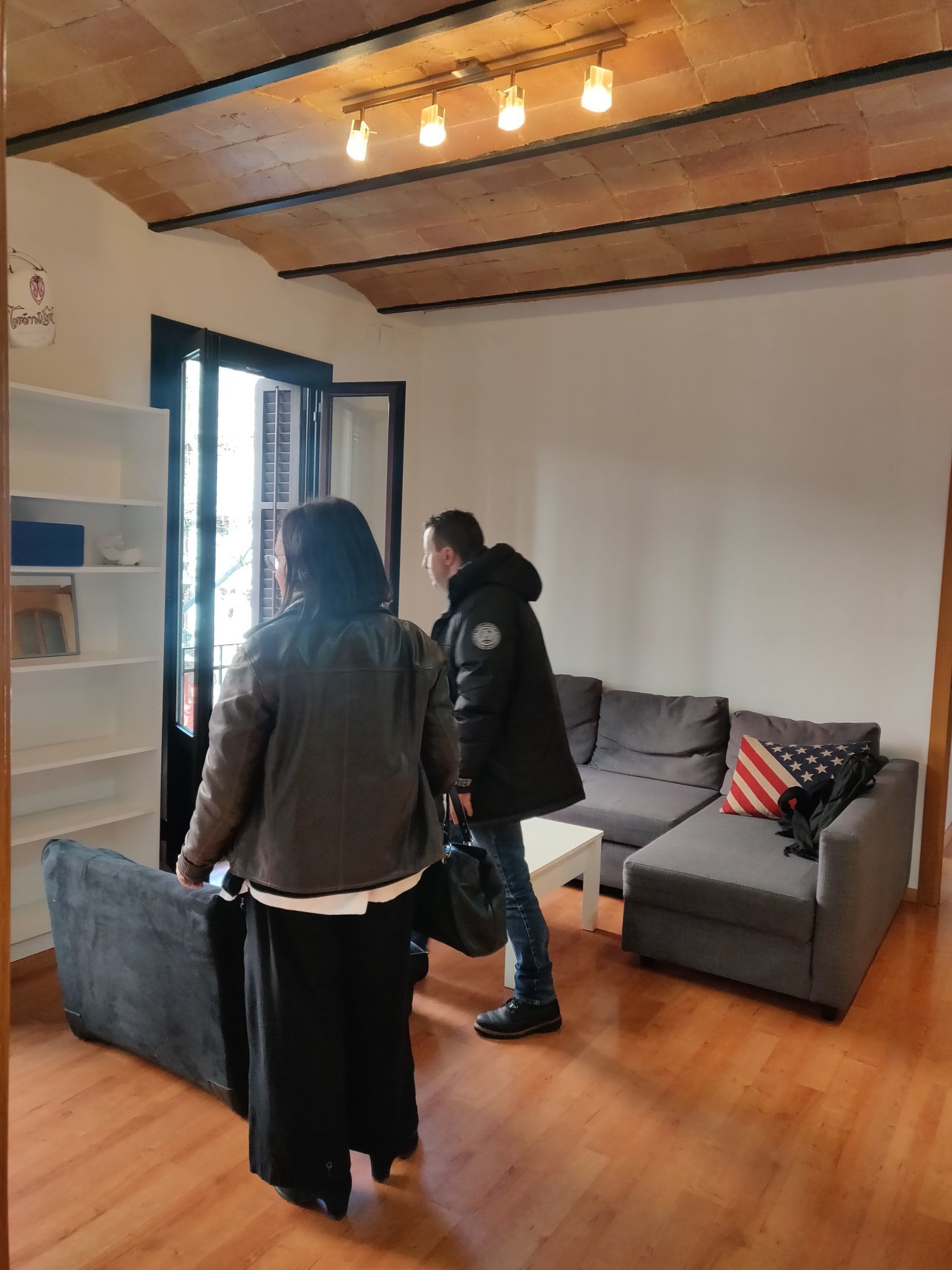 Al entrar al piso nos encontramos en el salón con encanta catalán: bóveda y viga en el techo y ladrillo en la pared. Con salida a dos balcones donde cabe mesita y sillas, le da al salón una sensación de amplitud y luminosidad espectacular.